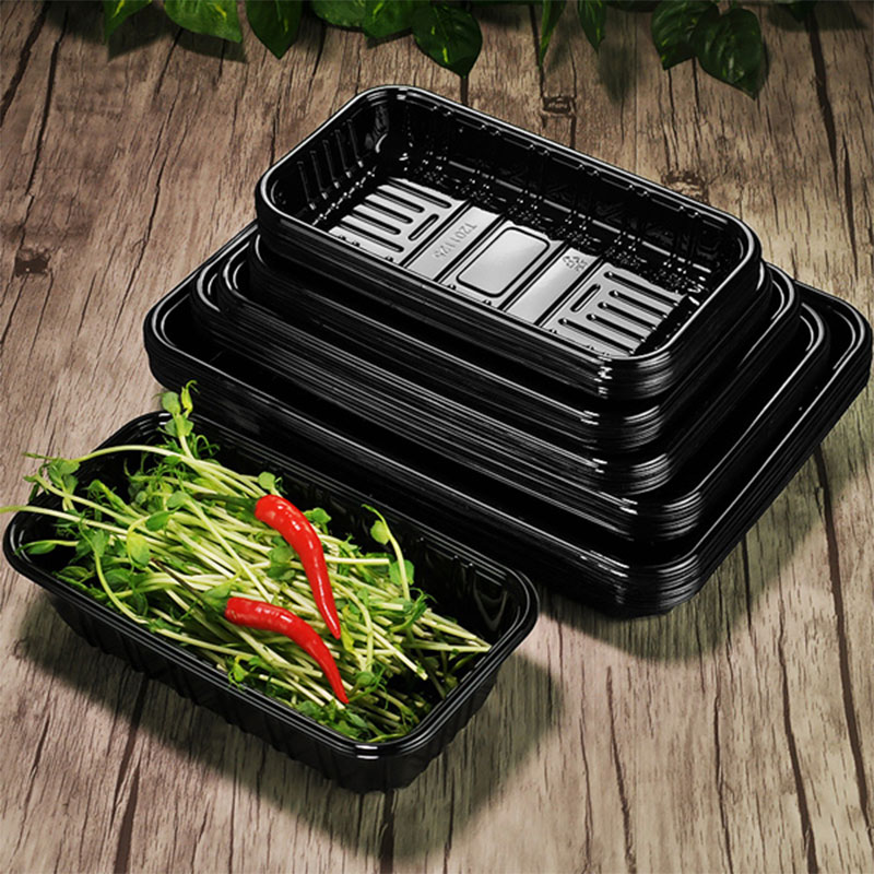 يمكن استخدام الصواني والصناديق البلاستيكية التي تستخدم لمرة واحدة على نطاق واسع في محلات السوبر ماركت لبيع الخضروات الطازجة والفواكه واللحوم والفواكه المجففة والبسكويت وغيرها من السلع المعبأة مسبقًا.