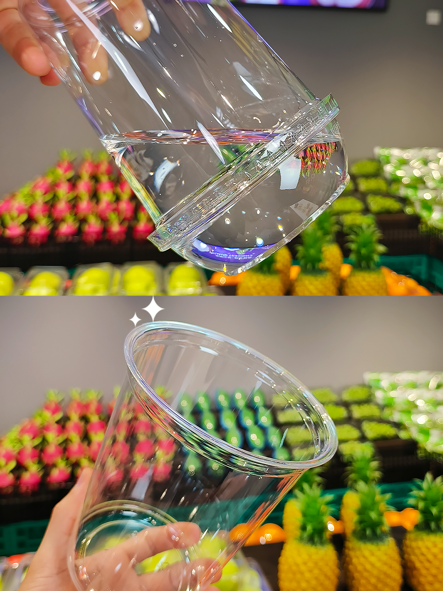 1. درجة عالية بوضوح: الكوب البلاستيكي مصنوع من مادة PET ككل، مع شفافية عالية وجماليات قوية.